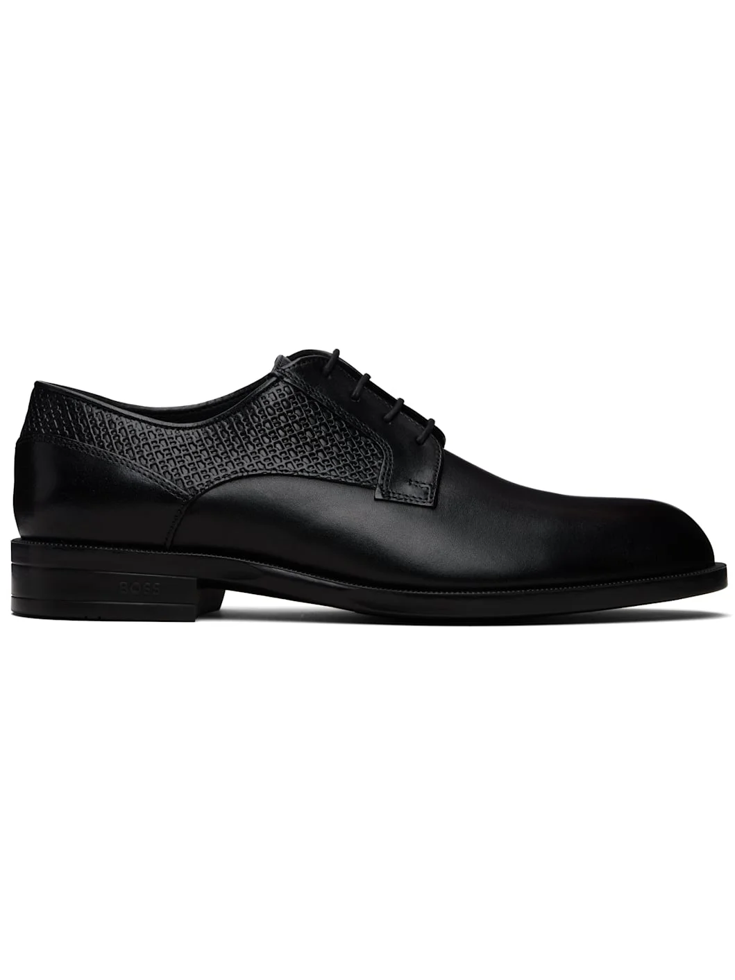 Polished leather derbys. · Lace-up closure · Graphic pattern embossed at sides and heel collar · Logo embossed at stacked rubber heel · Treaded rubber sole Supplier color: Black Upper: leather. Sole: rubber. Made in India 261085M225007