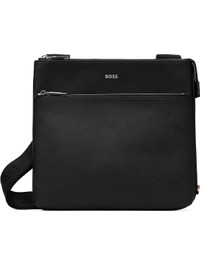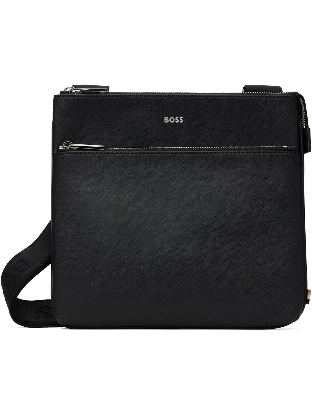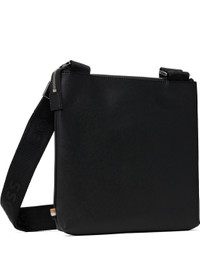Saffiano leather messenger bag in black. · Webbing press-release crossbody strap · Silver-tone logo stamp at face · Zip pockets at face · Zip closure · Patch pockets at interior · Sateen lining · Logo-engraved silver-tone hardware · H6" x W8.25" x D2" Supplier color: Black Leather. Made in Viet Nam 252085M170001