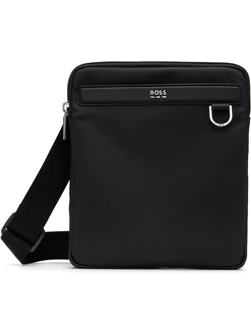 Canvas messenger bag. · Adjustable crossbody strap · Logo hardware at face · Patch pocket at back · Zip closure · Patch pocket at interior · Logo-woven twill lining · Silver tone hardware · H9.5” x W8.5” x D2” Supplier color: Black Textile. Made in China 252085M170027