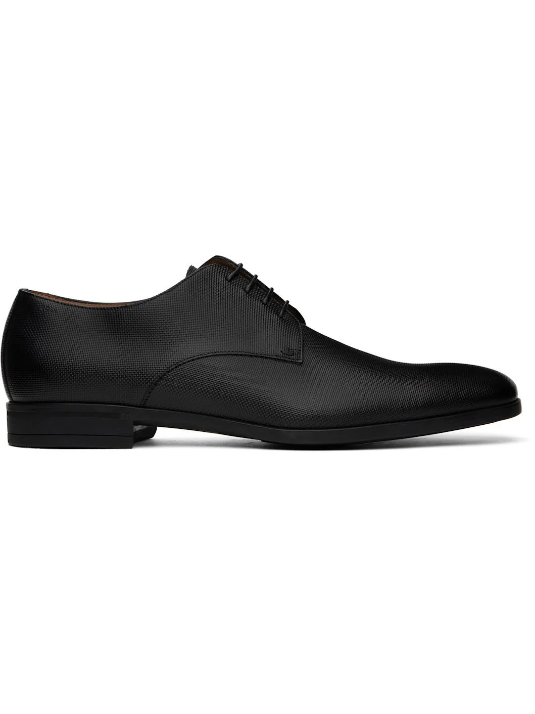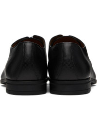 Textured leather derbys in black. · Almond toe · Lace-up closure · Logo printed at padded insole · Buffed leather lining · Rubber sole Supplier color: Black Upper: leather. Sole: rubber. Made in Italy 251085M225000