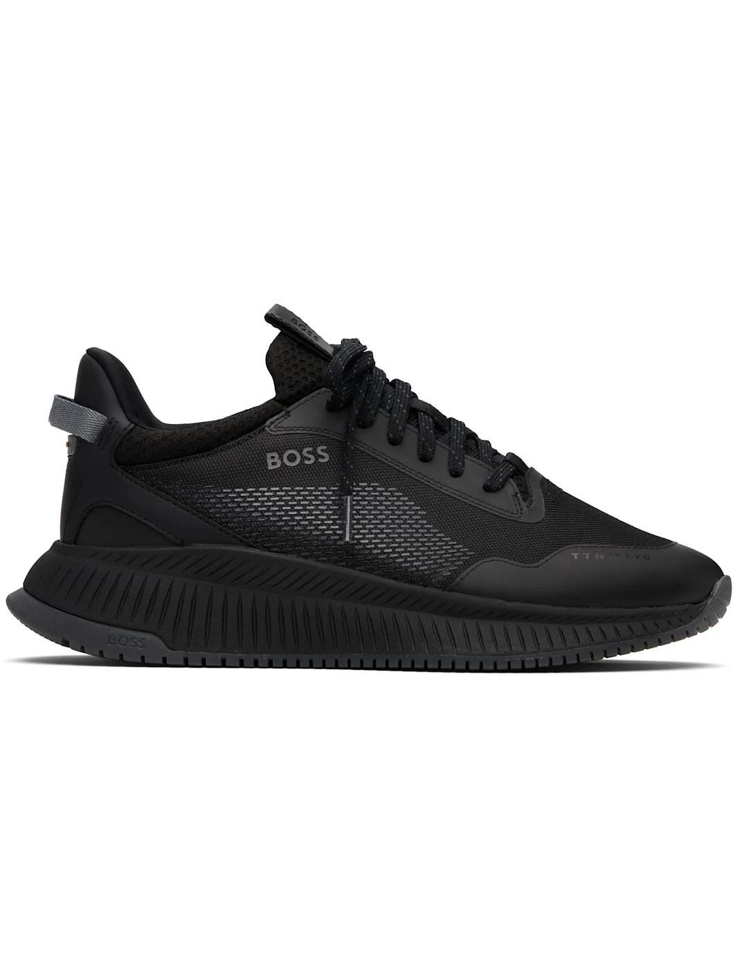 Low-top knit and buffed faux-leather sneakers. · Bonded trim throughout · Lace-up closure · Logo-printed pull-loop at tongue and heel tab · Logo bonded at outer side · Rubberized logo patch at heel counter · Logo embossed at foam rubber midsole · Treaded rubber outsole Supplier color: Black Upper: textile, synthetic. Sole: rubber. Made in Viet Nam 252085M237056