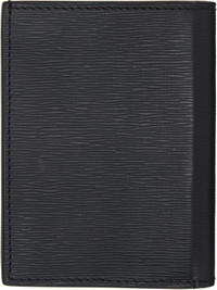 Saffiano leather bifold card holder. · Logo hardware at face · Patch pocket at back face · Six card slots and two patch pockets · Buffed and saffiano leather interior · Canvas and satin lining · H4.25" x W3.25" x D1" Supplier color: Black Leather. Made in India 261085M164020