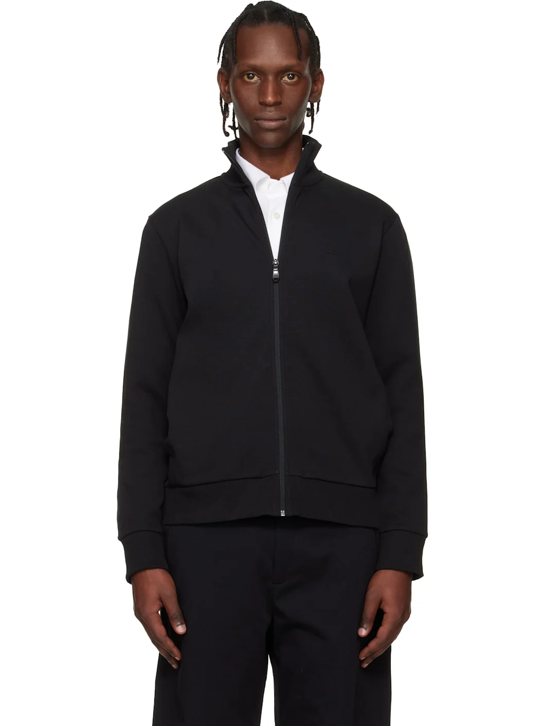 Stretch cotton jersey sweatshirt. · Rib-knit stand collar, hem, and cuffs · Zip closure · Logo bonded at chest · Seam pockets Supplier color: Black 95% cotton, 5% elastane. Made in Pakistan 261085M202021