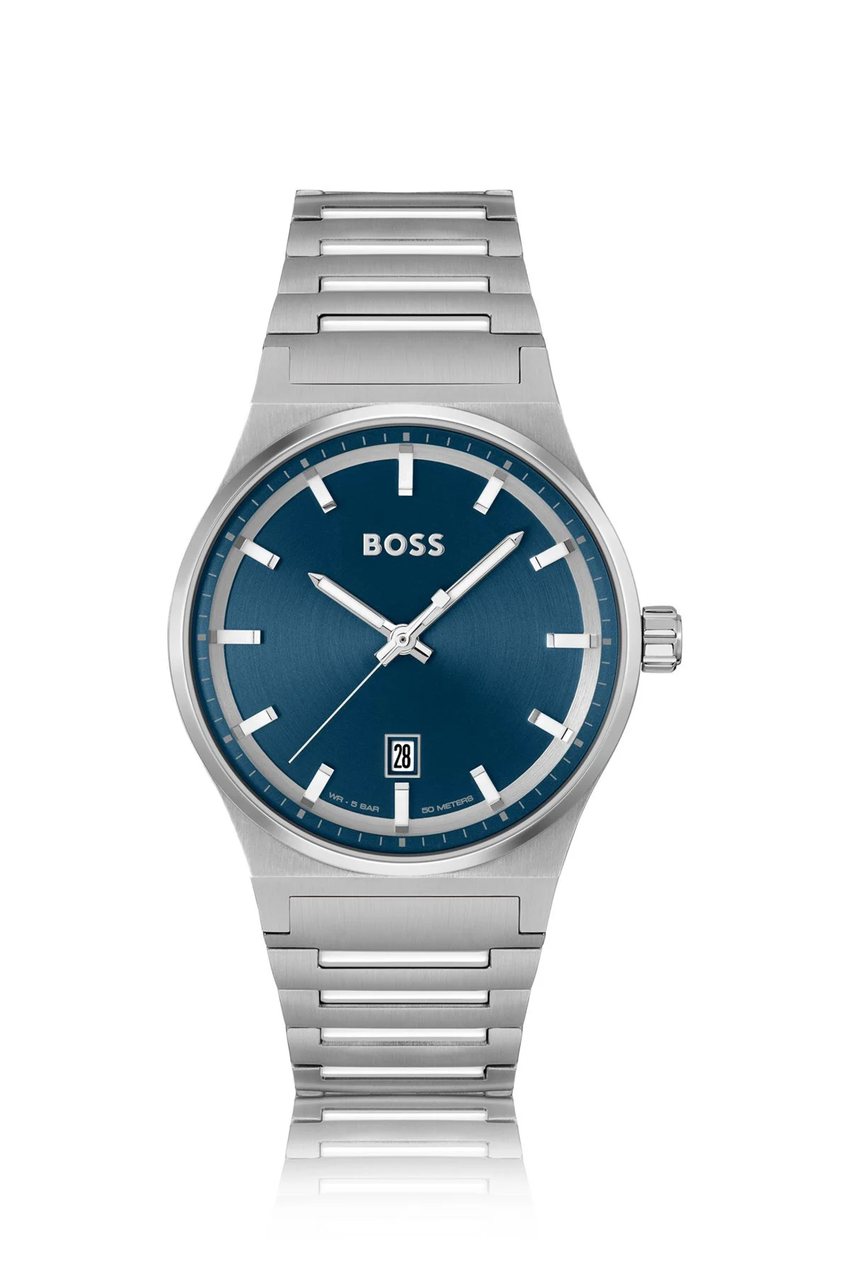 DETAILS CANDOR - 58129470 An elegant watch by BOSS, designed with a stainless steel link bracelet and a blue dial featuring circular brushing and polished indexes. Watch mechanism: Three-hand Dial color: Blue Strap material: Stainless steel Closure: Push-button deployment Case size: 1.61 in (41 mm) (0 inches) Water Resistance (in ATM): 5 ATM QUALITY & CARE INSTRUCTIONS Quality: 100% Stainless steel