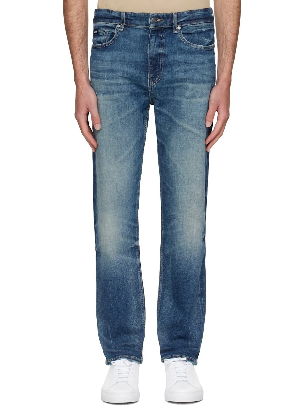 Stretch denim jeans. · Fading, whiskering, and distressing throughout · Belt loops · Logo flag at coin pocket · Five-pocket styling · Logo patch at back waistband · Logo hardware at back pocket · Contrast stitching in tan · Silver-tone hardware Supplier color: Blue 98% cotton, 2% elastane. Made in Tunisia 252085M186000