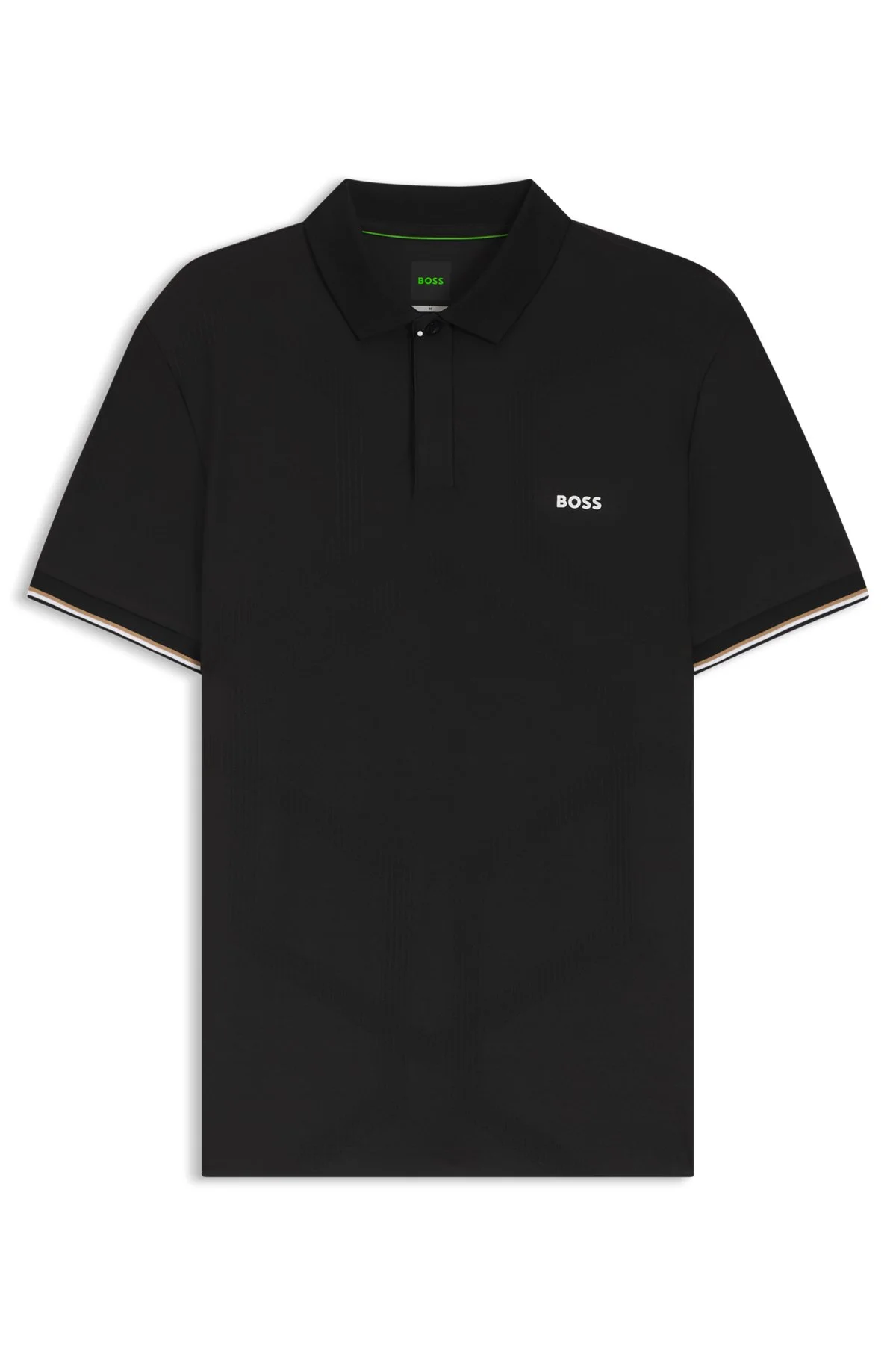 SIZE AND FIT The model wears a size M and is 6'2" tall with a, 38" chest, 30" waist and 37" hips. DETAILS Cut in bodymapping jersey with quick-dry performance, this regular BOSS Menswear polo shirt will upgrade any casual look. Contrast logo print. Signature cuff stripes. Regular fit Neckline: Flat-knit collar Number of buttons: 3 Short sleeves Flat-knit cuffs Standard length PL_GOC Chip Hexa - 50554561 QUALITY & CARE INSTRUCTIONS Do Not Tumble Dry Machine Wash Cold Gentle Do Not Dry Clean Material: 93% Polyester, 7% Elastane Iron Low Heat Do Not Bleach