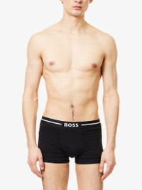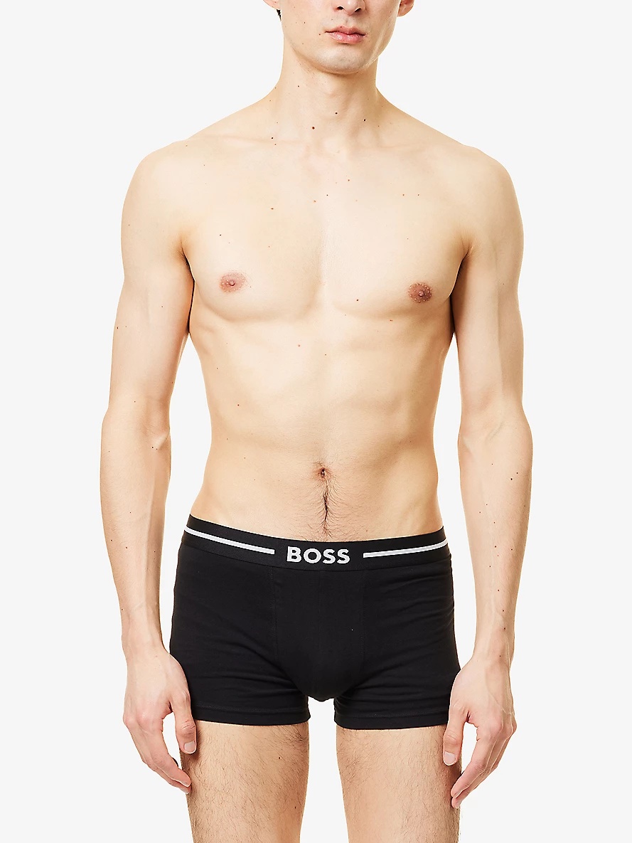 PRODUCT DETAILS - BOSS stretch-cotton trunks - 95% cotton, 5% elastane - Low rise, elasticated logo waistband, supportive panel at front, pack of three - Machine wash at 30°C - Model is 6ft 2in/1.88m and wears a size medium - Lightweight, stretchy Ref: R04454525