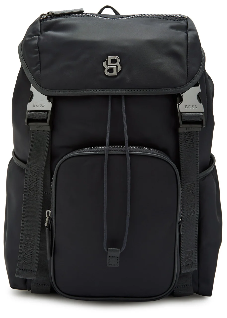 Info & Care Boss nylon backpack Top handle, two adjustable shoulder straps, zip-fastening pocket at top, designer plaque, two side patch pockets, zip-fastening front patch pocket, logo-jacquard straps, padded back, trolley sleeve, internal slip pocket, internal zip-fastening pocket, fully lined Partially concealed drawstring and buckle fastenings at front Size & Fit Width: 12 inches/ 30.5cm Height: 16 inches/ 40.cm Depth: 6.5 inches/ 16cm