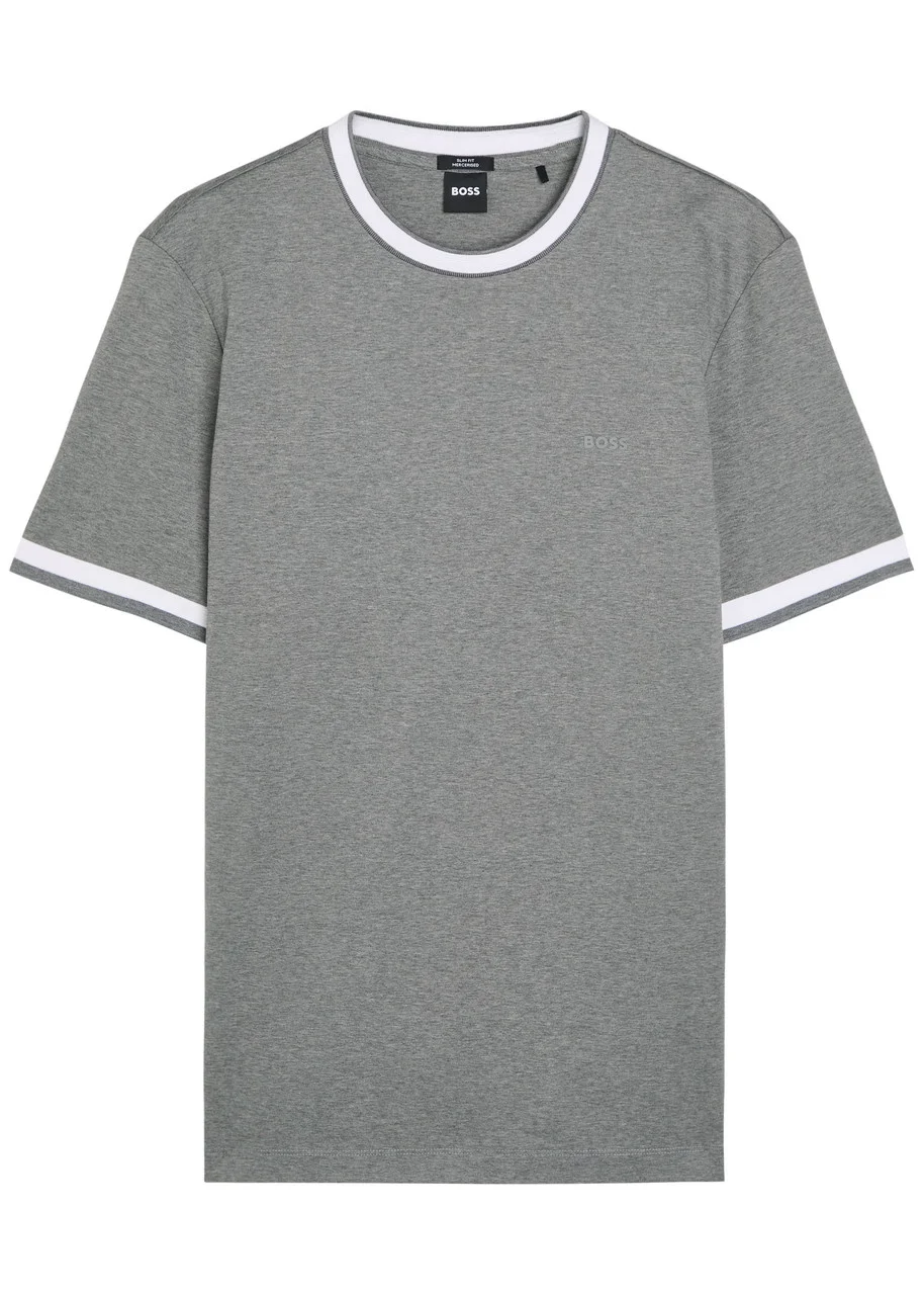 Info & Care Boss cotton T-shirt Crew-neck, rubberised logo at chest, designer tag at side, splits at side hem, striped intarsia at ribbed trims Slips on 100% cotton Machine wash Size & Fit Length shoulder to hem: 27 inches/ 68.5cm Midweight Regular fit Model is 6'1"/ 185cm, chest size 38.5 inches and wears a size medium