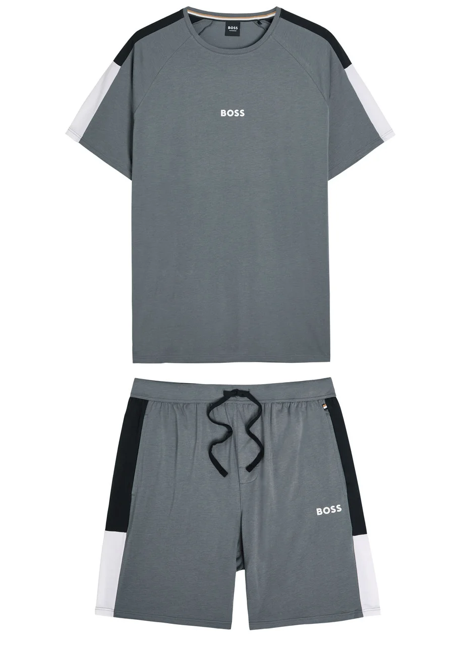 Info & Care Boss cotton-blend lounge set T-shirt:;Crew-neck, colour-blocked panels through raglan sleeves, logo print, slips on Shorts: Elasticated drawstring waistband, designer tag, side slip pockets,;colour-blocked panels through;sides, logo print, pull on 55% cotton, 37% modal, 8% elastane Machine wash Size & Fit Length shoulder to hem: 28 inches/ 71cm Length waist to hem: 18 inches/ 46cm Midweight Relaxed fit Model is 6'2"/ 188cm, chest size 38 inches and wears a size medium