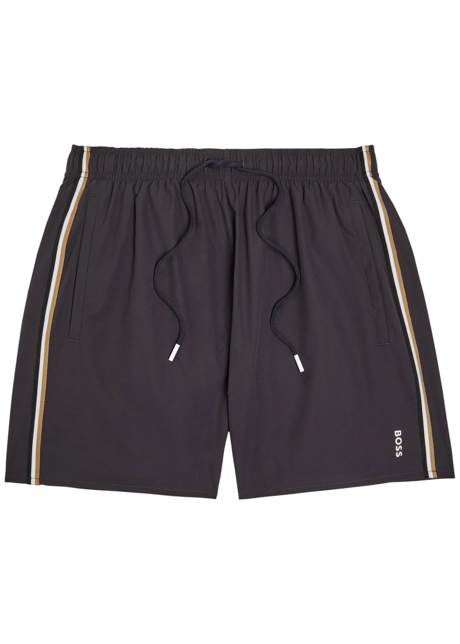 Info & Care Boss;stretch-shell swim shorts Elasticated drawstring waistband, side slip pockets, signature striped panel through sides, logo print, Velcro-fastening back patch pocket, internal mesh briefs lining Pull on 100% elastomultiester; lining: 100% polyester Machine wash Size & Fit Length;waist to hem:;15 inches/ 38cm Midweight Regular fit Model is 6'2"/ 188cm, chest size 38 inches and wears a size;medium