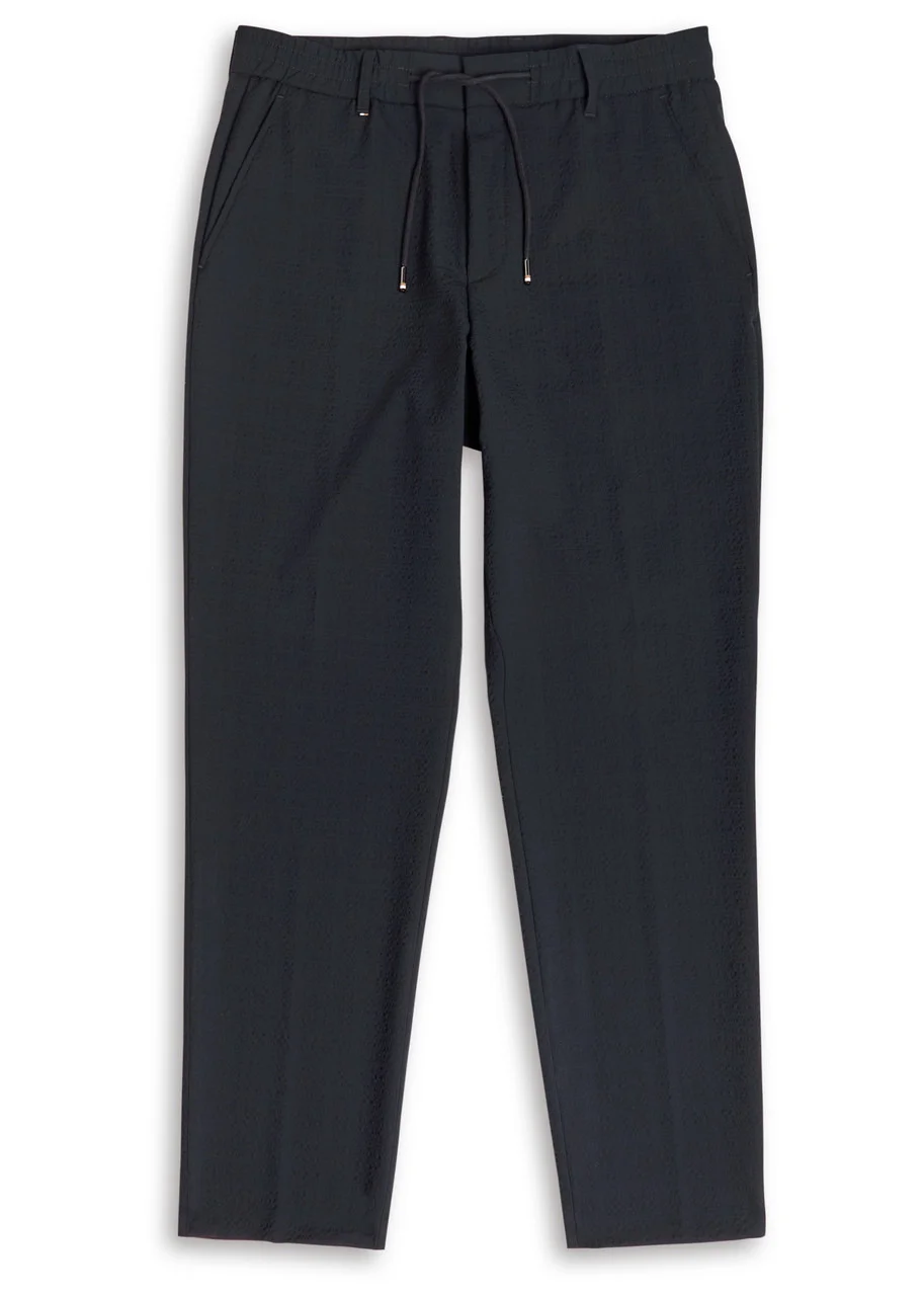 Info & Care Boss seersucker trousers Drawstring waist, belt loops, designer tag, side slip pockets, pressed crease through legs, two slit pockets Concealed hook and zip fastening; 68% polyester, 29% viscose, 3% elastane Dry clean Size & Fit Inside leg length: 29.5 inches/ 75cm Midweight Slightly tapered cut Model is 6'1"/ 186cm and wears a size;IT48