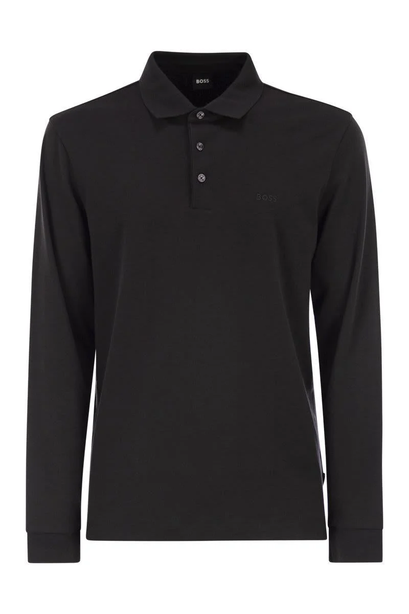 A true staple in any man's wardrobe, this long-sleeved polo shirt by BOSS Menswear is a refined classic. Crafted from soft cotton with a straight fit. - Regular fit - Flat knit collar - Number of buttons: 3 - Long sleeves - Standard length DESIGNER ID: 50468392 001 Gender: Men Material: 100% COTTON Color: Black Made in: Imported Product ID: 50468392 001 *Import tax/duty will be calculated at checkout (If applicable)