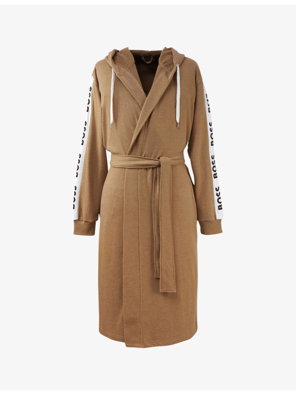 PRODUCT DETAILS - BOSS cotton-blend bathrobe - 50% cotton, 50% polyester - Self-tie fastening - Regular fit, long sleeves, drawstring hood, logo embroidery at chest, logo-print sleeve stripes, ribbed cuffs, matching tie waist belt - Machine wash mild