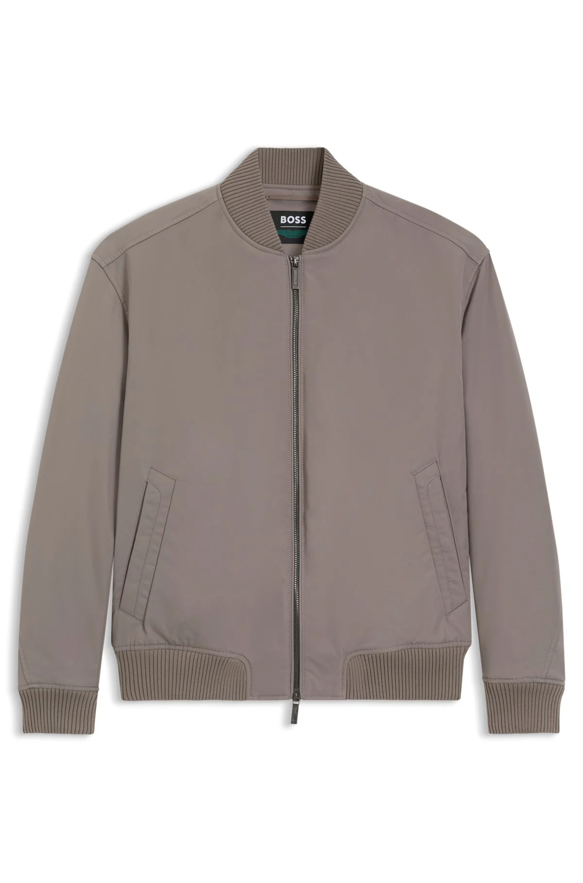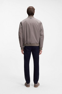 SIZE AND FIT The model wears a size 40R and is 6'2" tall with a, 35" chest, 29" waist and 35" hips. DETAILS An elegant men's bomber jacket from BOSS x ASTON MARTIN, crafted in compact twill featuring a protective water-repellent finish. Straight fit with ribbed trims. Iconic wing detailing at the back neck. BOSS x ASTON MARTIN showcases impeccable craftsmanship and sophistication. Regular fit Fastening top: Zip closure Pockets top: Welt pockets Inside jet pocket with button Ribbed cuffs Fully lined Standard length Fit back length: 67 cm (26 inches) Cantin_AM - 50553642 QUALITY & CARE INSTRUCTIONS Do Not Dry Clean Tumble Dry Low Heat Machine Wash Cold Gentle Do Not Bleach Iron Low Heat Material: 100% Polyester, Lining: 100% Polyester, Back lining: 55% Polyester, 45% Viscose, Knitwear: 93% Polyester, 7% Elastane, Wadding: 100% Polyester