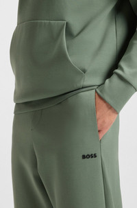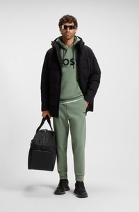 SIZE AND FIT The model wears a size M and is 6'0" tall with a, 38" chest, 30" waist and 37" hips. DETAILS Featuring a molded logo and sporty stripes, these regular-fit BOSS Menswear tracksuit bottoms are an easy building block. Cotton with stretch. Cuffed hems. Regular fit Regular rise Drawstring Pockets bottom front: Side pockets Pockets bottom back: Welt pocket Pants Zone - 50543070 QUALITY & CARE INSTRUCTIONS Material: 62% Cotton, 33% Polyester, 5% Elastane, pocketing: 100% Polyester Iron Low Heat Do Not Tumble Dry Do Not Bleach Do Not Dry Clean Machine Wash Cold Gentle