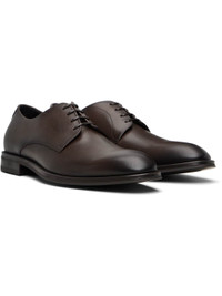 Buffed leather derbys. · Almond toe · Lace-up closure · Embroidered detailing at outer heel · Serrated edge at welt · Treaded rubber sole Supplier color: Dark brown Upper: leather. Sole: rubber. Made in Italy 261085M225015