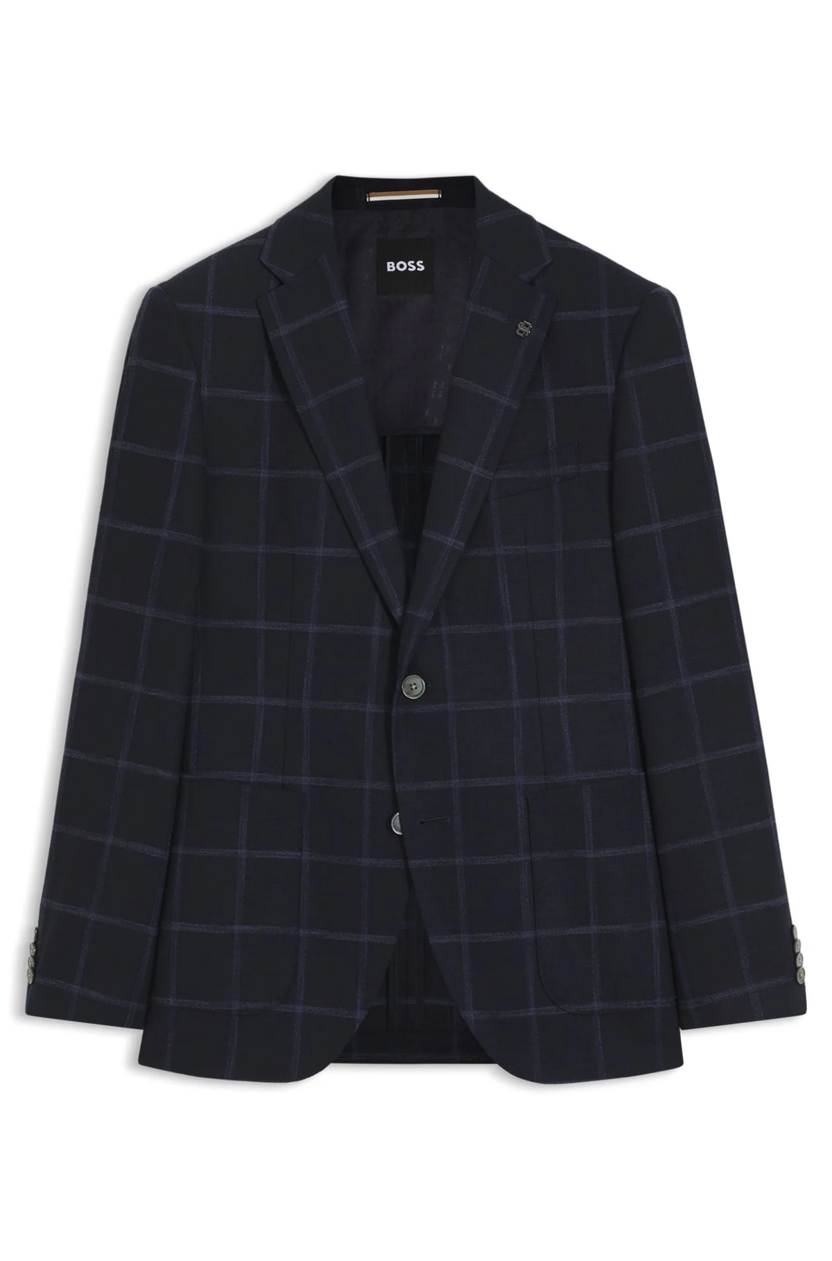 DETAILS Offering heritage appeal with its classic check in a regular fit, this BOSS Menswear blazer is blended with virgin wool, silk and cotton. Constructed shoulder. Regular fit Notched lapels Fastening top: Button closure Number of buttons: 2 Welt chest pockets Pockets top: Patch pockets Kissing buttons on the cuff Side vent Partially lined H-Janson-233 - 50556957 QUALITY & CARE INSTRUCTIONS Iron Low Heat Do Not Bleach Do Not Wash Do Not Tumble Dry Material: 48% Virgin wool, 24% Silk, 20% Cotton, 5% Polyamid, 3% Elastane, Lining: 100% Viscose, Sleeve lining: 100% Viscose Reduced Dry Clean
