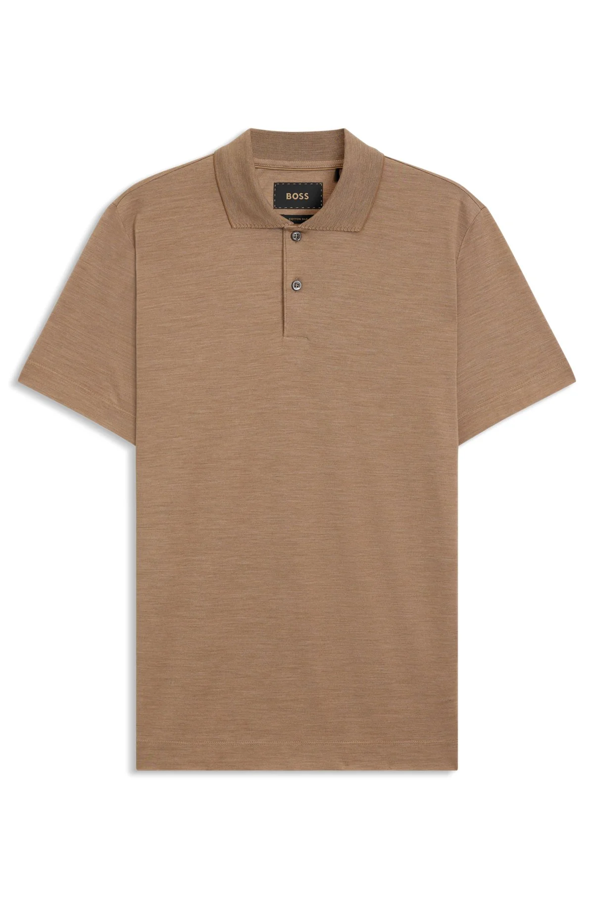 SIZE AND FIT The model wears a size M and is 6'1" tall with a, 36" chest, 29" waist and 36" hips. DETAILS In a fine cotton-silk blend, this regular-fit BOSS Menswear polo shirt will elevate any look. MOP buttons and contrast collar tipping. Regular fit Number of buttons: 2 Short sleeves Standard length L-Perry 115 - 50549325 QUALITY & CARE INSTRUCTIONS Iron Low Heat Reduced Dry Clean Hand Wash Only Material: 52% Cotton, 48% Silk Do Not Bleach Do Not Tumble Dry