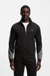 SIZE AND FIT The model wears a size M and is 6'0" tall with a, 36" chest, 31" waist and 35" hips. DETAILS With its contrast details and metallic branding, this BOSS Menswear jacket offers distinctive layering. Cut to a straight fit. Regular fit Neckline: Zip neck Pockets top: Welt pockets Tracksuit Jacket - 50554793 QUALITY & CARE INSTRUCTIONS Machine Wash Warm Do Not Dry Clean Material: 70% Cotton, 30% Polyester Do Not Bleach Do Not Tumble Dry Iron Low Heat