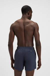 SIZE AND FIT The model wears a size M and is 6'2" tall with a, 0" chest, 28" waist and 36" hips. DETAILS Octopus - 50514502 Adjustable swim shorts by BOSS in quick-drying fabric with full lining and a vertical logo in contrast. QUALITY & CARE INSTRUCTIONS Quality: 100% Polyamide, Lining: 100% Polyester Do Not Tumble Dry Machine Wash Cold Do Not Bleach Do Not Iron Do Not Dry Clean