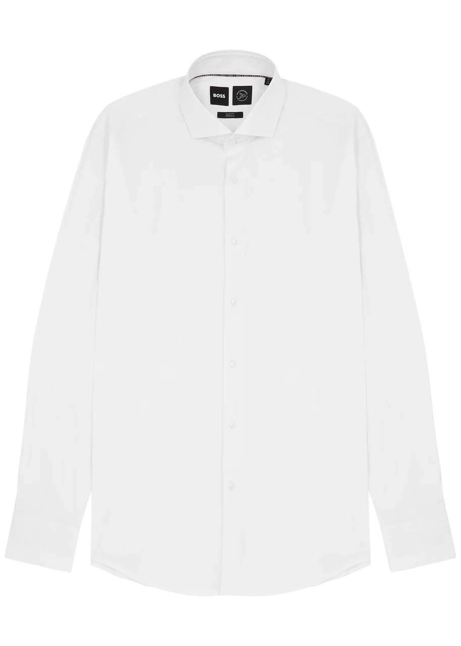 INFO & CARE - Boss cotton-blend shirt - Button-fastening cuffs, curved hem, longer back hem - Button-fastenings through front - 75% cotton, 20% polyamide, 5% elastane - Machine wash SIZE & FIT - Length shoulder to hem: 30.5 inches/ 77.5cm; back: 31.5 inches/ 80cm - Midweight - Regular fit - Model is 6'2"/ 188cm, chest size 38 inches and wears a size UK15.5