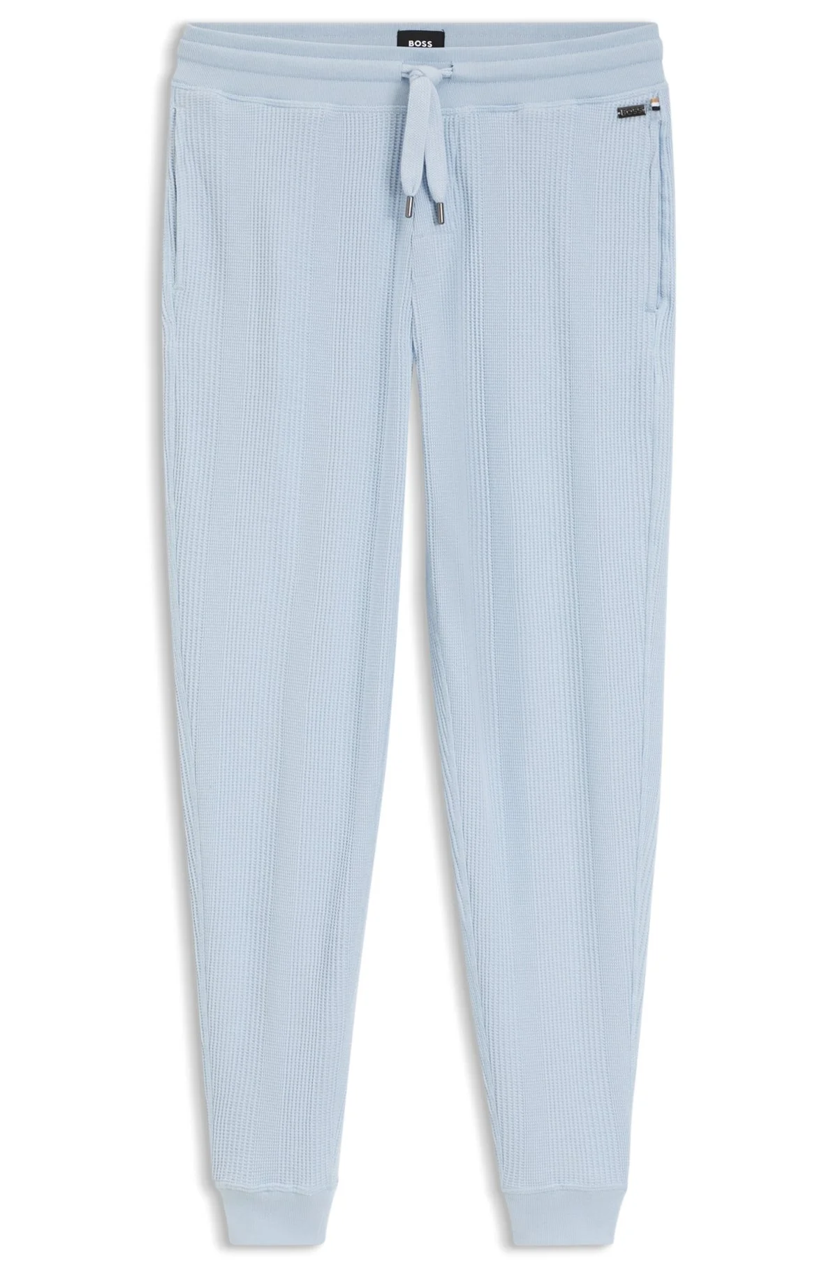 DETAILS Create laid-back looks in comfort with the cotton-blend waffle fabric of these BOSS Menswear sweatpants. Metal logo detail. Cuffed hems. Covered waistband Drawstring Pockets bottom front: Side pockets Structure Pants - 50540577 QUALITY & CARE INSTRUCTIONS Machine Wash Warm Do Not Tumble Dry Iron Medium Heat Material: 60% Cotton, 40% Polyester Do Not Dry Clean Do Not Bleach