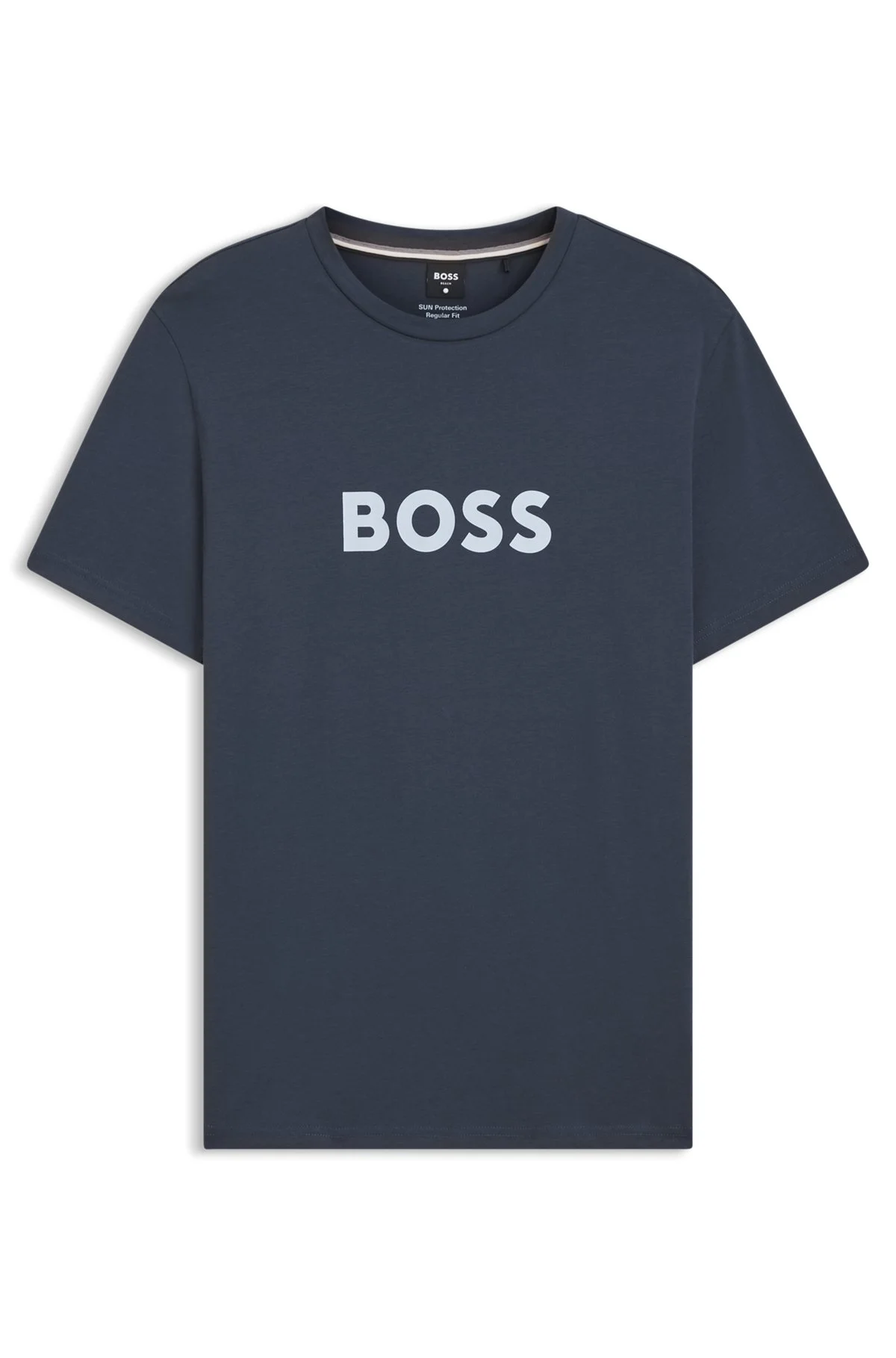 SIZE AND FIT The model wears a size M and is 6'0" tall with a, 38" chest, 29" waist and 38" hips. DETAILS Hit the beach in style with the large logo print and comfy cotton of this BOSS Menswear T-shirt. Cut to an easy regular fit. Regular fit Neckline: Crew neck T-Shirt RN - 50491706 QUALITY & CARE INSTRUCTIONS Machine Wash Cold Material: 100% Cotton Do Not Dry Clean Do Not Tumble Dry Iron Low Heat Do Not Bleach