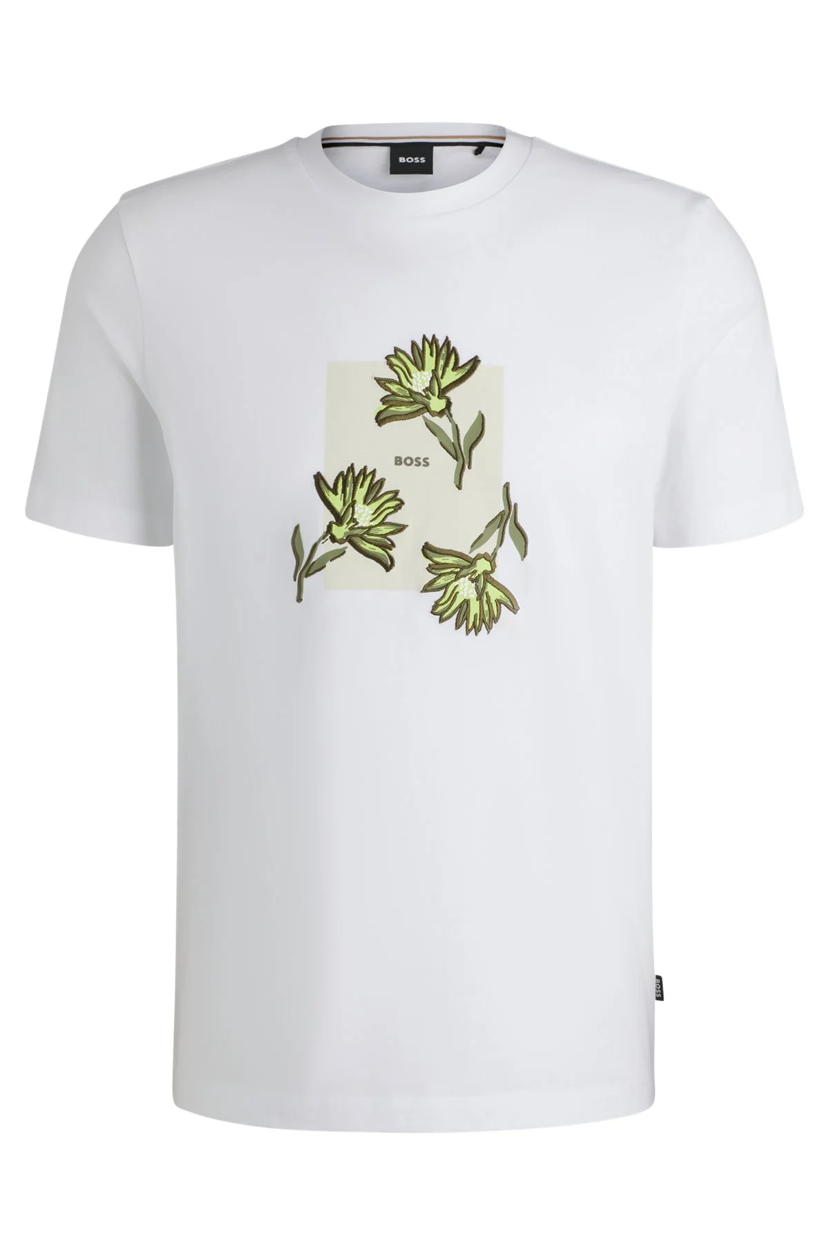 SIZE AND FIT The model wears a size M and is 6'2" tall with a, 37" chest, 33" waist and 35" hips. DETAILS C-Thompson 13 - 50536763 Revitalize your casual collection with this BOSS Menswear T-shirt. Crafted in soft cotton with a logo and floral artwork on the chest. Regular fit Neckline: Crew neck Short sleeves QUALITY & CARE INSTRUCTIONS Quality: 100% Cotton Do Not Bleach Do Not Tumble Dry Machine Wash Cold Gentle Do Not Dry Clean Iron Low Heat