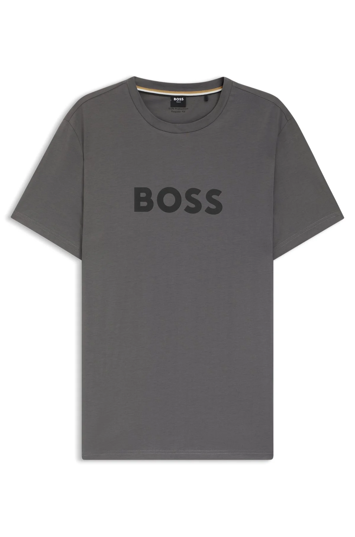 SIZE AND FIT The model wears a size M and is 6'2" tall with a, 36" chest, 31" waist and 38" hips. DETAILS Ideal for the beach, this BOSS Menswear T-shirt is cut to a straight fit in breathable cotton jersey. Large contrast logo print. Regular fit Neckline: Crew neck T-Shirt RN - 50491706 QUALITY & CARE INSTRUCTIONS Material: 100% Cotton Do Not Bleach Do Not Tumble Dry Do Not Dry Clean Iron Low Heat Machine Wash Cold