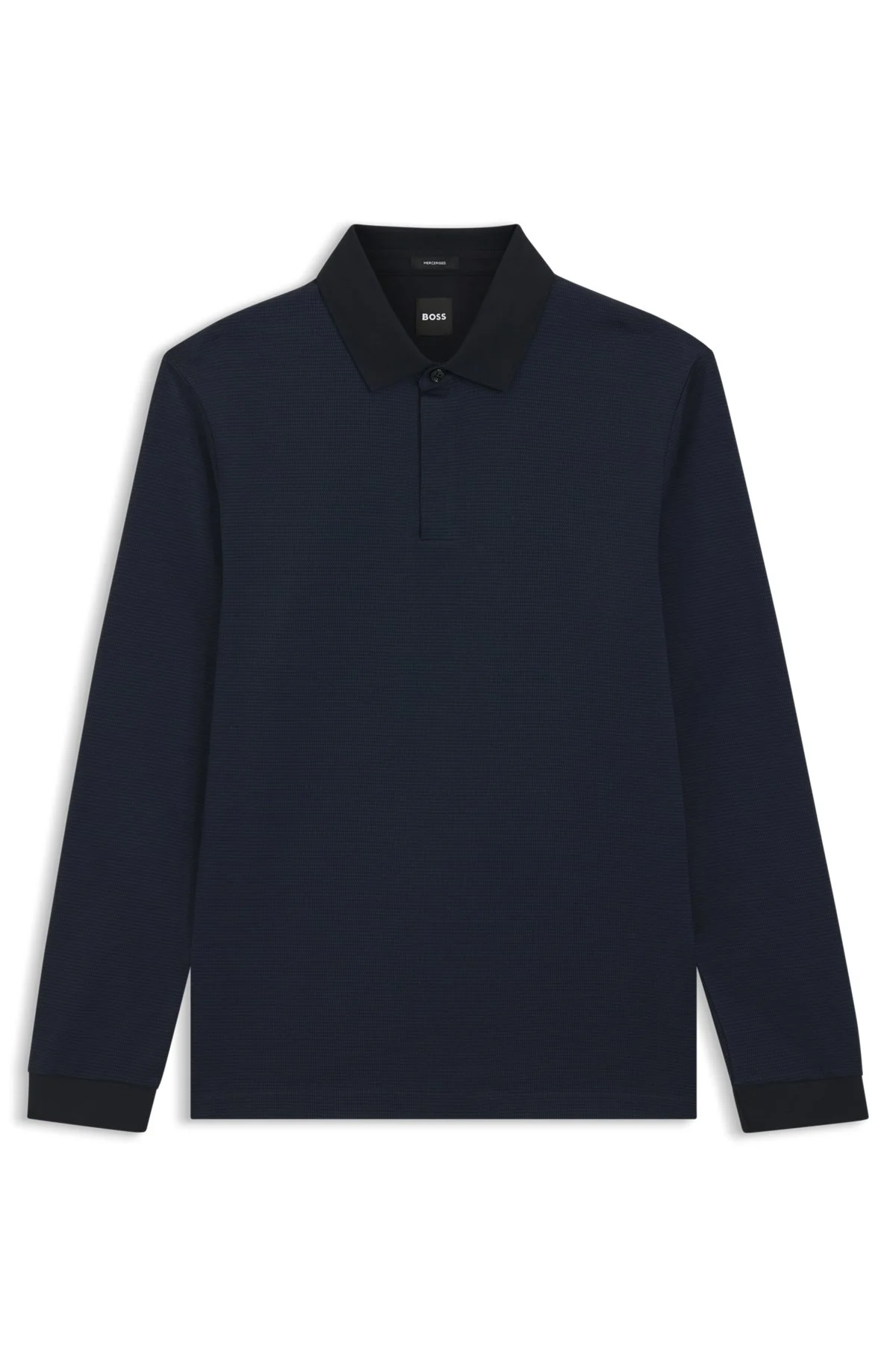 SIZE AND FIT The model wears a size L and is 6'1" tall with a, 36" chest, 29" waist and 37" hips. DETAILS H-Pado 432 - 50544254 The rich structure of this BOSS Menswear polo shirt is offset by the plain collar. Straight fit with concealed closure. Extra-soft mercerized cotton. Regular fit Neckline: Polo collar Number of buttons: 2 Long sleeves Ribbed cuffs Side slit QUALITY & CARE INSTRUCTIONS Do Not Tumble Dry Machine Wash Cold Gentle Quality: 100% Cotton Reduced Dry Clean Iron Low Heat Do Not Bleach