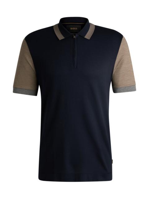SIZE AND FIT The model wears a size M and is 6'1" tall with a, 36" chest, 29" waist and 37" hips. DETAILS L-Parkau 05 - 50531362 A zip-neck polo shirt by BOSS Menswear. Featuring contrast details, this regular-fit top is crafted in a luxurious blend of cotton and silk. Regular fit Short sleeves Standard length QUALITY & CARE INSTRUCTIONS Iron Low Heat Quality: 75% Cotton, 25% Silk Hand Wash Only Reduced Dry Clean Do Not Bleach Do Not Tumble Dry