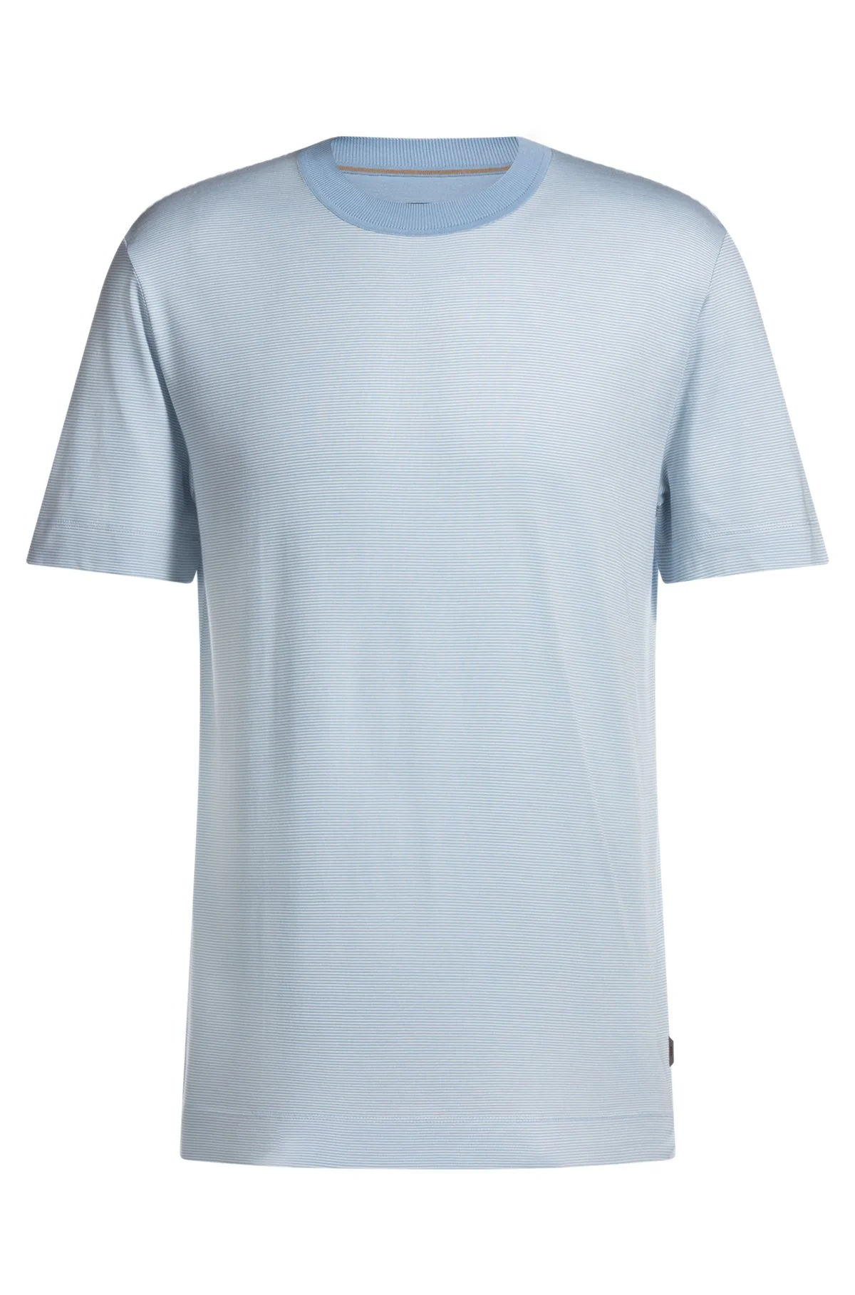 SIZE AND FIT The model wears a size M and is 6'1" tall with a, 36" chest, 29" waist and 37" hips. DETAILS L-Tesar 15 - 50537217 Patterned with fineline stripes, this summery BOSS Menswear T-shirt is an elevated casual option. Cotton and luxurious silk with a tonal collar. Regular fit. Regular fit Neckline: Crew neck Short sleeves Standard length QUALITY & CARE INSTRUCTIONS Iron Low Heat Quality: 75% Cotton, 25% Silk Hand Wash Only Reduced Dry Clean Do Not Bleach Do Not Tumble Dry