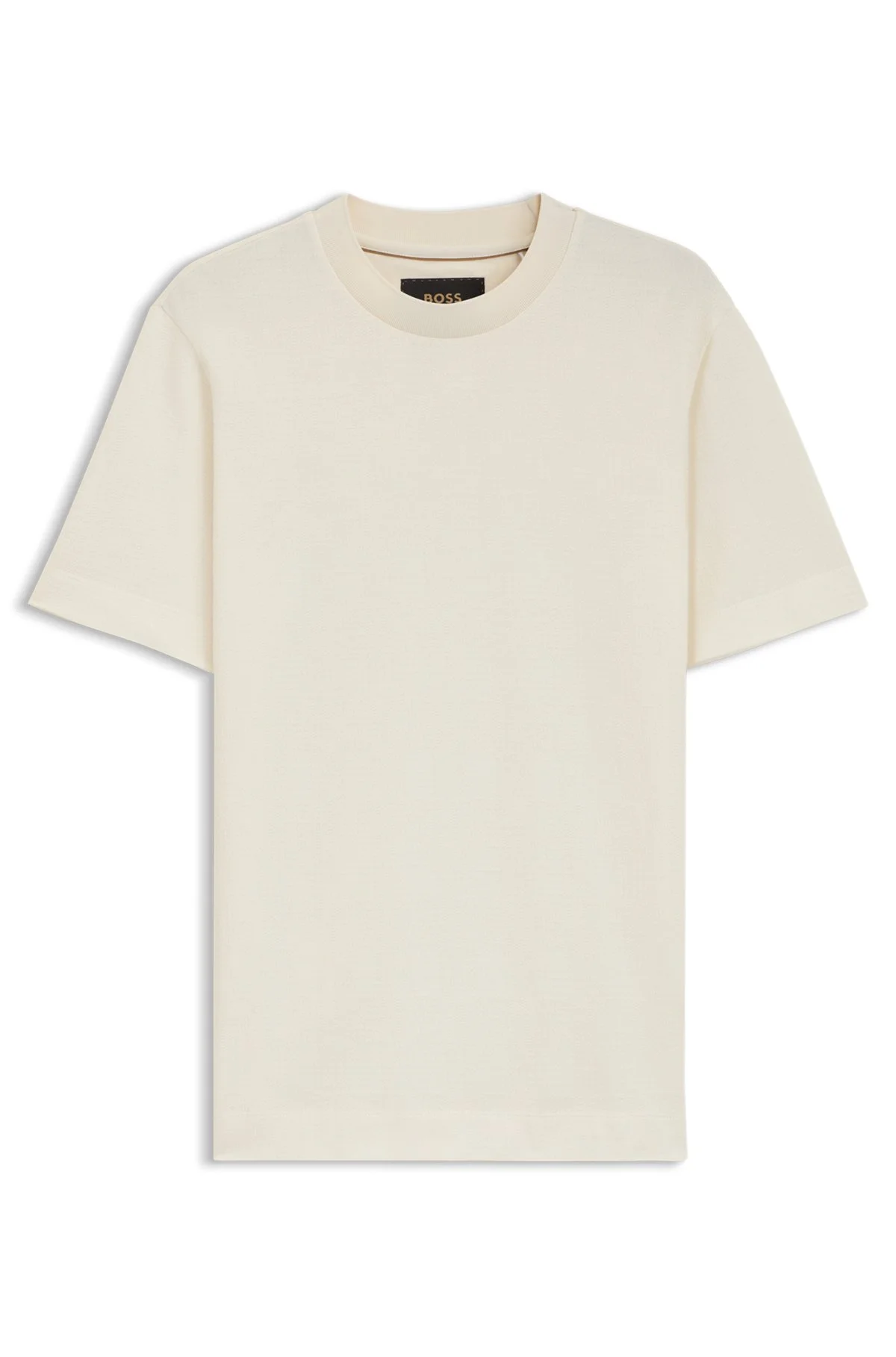 SIZE AND FIT The model wears a size M and is 6'1" tall with a, 33" chest, 31" waist and 33" hips. DETAILS L-Tesar 111 - 50545188 Mercerized for extra softness and sheen, this BOSS Menswear T-shirt has an elevated tonal check. Cotton-silk blend. Straight fit. Regular fit Neckline: Crew neck Short sleeves Side slit QUALITY & CARE INSTRUCTIONS Do Not Bleach Hand Wash Only Do Not Tumble Dry Quality: 82% Cotton, 18% Silk Reduced Dry Clean Iron Low Heat