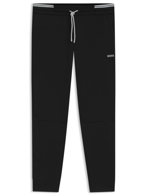 SIZE AND FIT The model wears a size M and is 6'2" tall with a, 36" chest, 31" waist and 38" hips. DETAILS Pants Zone - 50543070 Featuring a molded logo and sporty stripes, these regular-fit BOSS Menswear tracksuit bottoms are an easy building block. Cotton with stretch. Cuffed hems. Regular fit Regular rise Drawstring Pockets bottom front: Side pockets Pockets bottom back: Welt pocket QUALITY & CARE INSTRUCTIONS Do Not Tumble Dry Machine Wash Cold Gentle Iron Low Heat Quality: 62% Cotton, 33% Polyester, 5% Elastane, pocketing: 100% Polyester Do Not Bleach Do Not Dry Clean