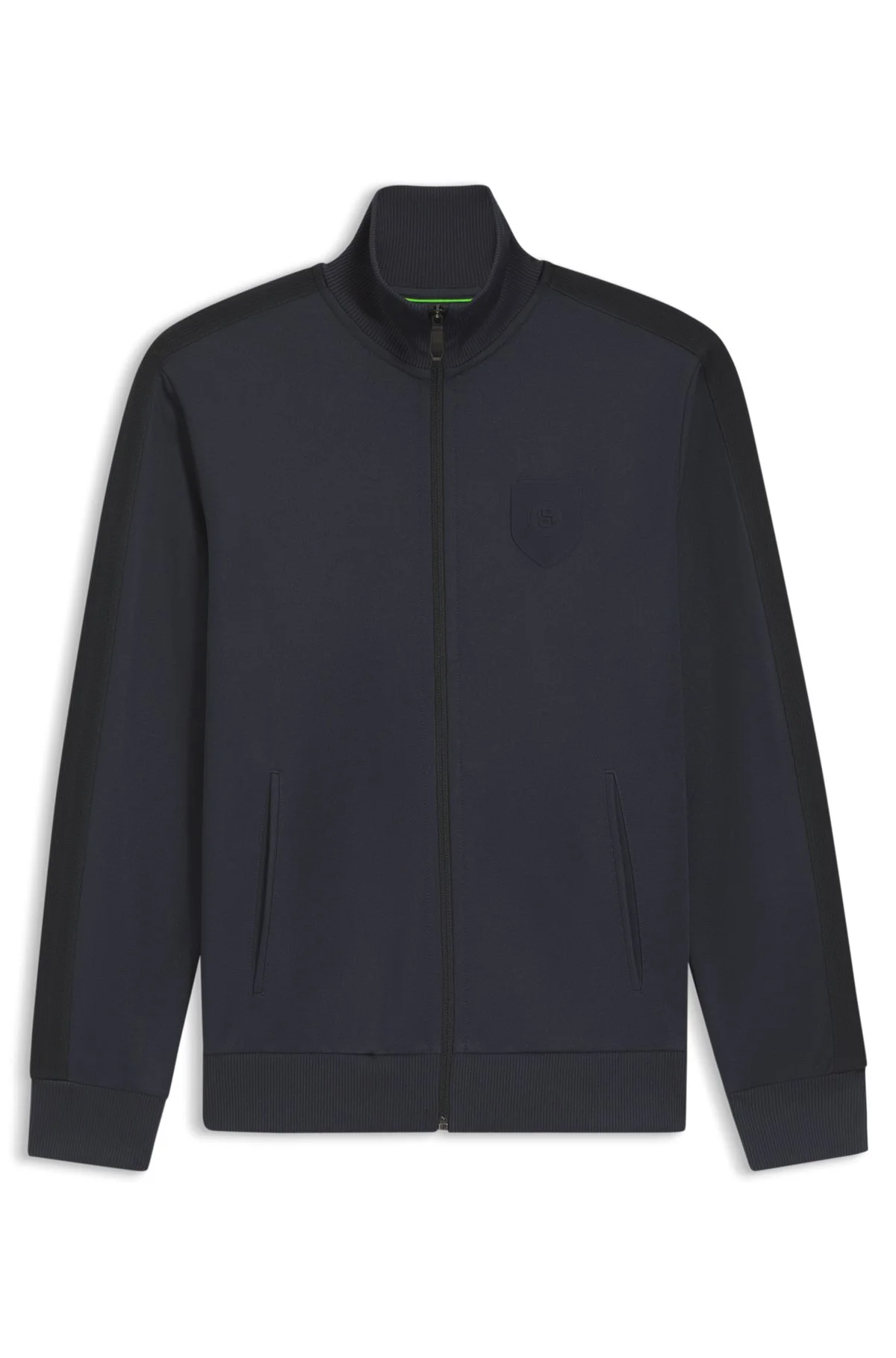 SIZE AND FIT The model wears a size M and is 6'2" tall with a, 38" chest, 30" waist and 37" hips. DETAILS With a laid-back fit and distinctive crest logo, this BOSS Menswear sweatshirt is a casual must. Sleeve inserts. Relaxed fit Neckline: Stand collar Fastening top: Zip closure Pockets top: Welt pockets Long sleeves Ribbed cuffs Standard length SW_BB BC Lux Skarley - 50554585 QUALITY & CARE INSTRUCTIONS Machine Wash Cold Gentle Iron Low Heat Do Not Tumble Dry Material: 57% Polyester, 43% Cotton Do Not Dry Clean Do Not Bleach