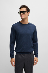 SIZE AND FIT The model wears a size M and is 6'1" tall with a, 36" chest, 29" waist and 34" hips. DETAILS Leno-P - 50468239 A soft and breathable sweater by BOSS Menswear. Cut to a slim fit, this crew-neck layer is crafted in merino wool. Neckline: Crew neck Long sleeves Standard length QUALITY & CARE INSTRUCTIONS Do Not Bleach Cold, gentle machine wash; reduced spin speed. Do Not Tumble Dry Quality: 100% Virgin wool Iron Medium Heat Dry Clean Only