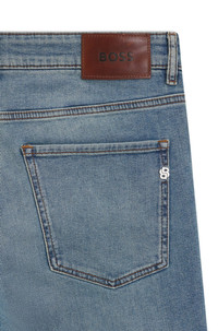 SIZE AND FIT The model wears a size 32/32 and is 6'1" tall with a, 36" chest, 29" waist and 34" hips. DETAILS H-Delaware - 50524017 Slim-fitting jeans with a pure-blue tone by BOSS. Crafted in comfort-stretch denim, this regular-rise pair features authentic signature trims. Slim fit Regular rise Button and zip closure Pockets bottom front: Side pockets Slim leg Pockets bottom back: Patch pocket Standard length Fit foot width: 35,4 cm (13.9 inches) QUALITY & CARE INSTRUCTIONS Quality: 98% Cotton, 2% Elastane Do Not Bleach Do Not Tumble Dry Iron Medium Heat Do Not Dry Clean Machine Wash Cold Gentle