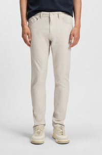 DETAILS P-Delaware5 - 50543954 Offering dependable wrinkle resistance, these BOSS Menswear trousers are so easy to style. Clean fit in stretch dobby for dynamic flexibility. Slim fit Regular rise Button and zip closure Slim leg Pockets bottom front: Side pockets Pockets bottom back: Patch pocket QUALITY & CARE INSTRUCTIONS Do Not Bleach Machine Wash Cold Gentle Do Not Tumble Dry Do Not Dry Clean Quality: 75% Polyester, 21% Viscose, 4% Elastane, pocketing: 65% Polyester, 35% Cotton Iron Medium Heat