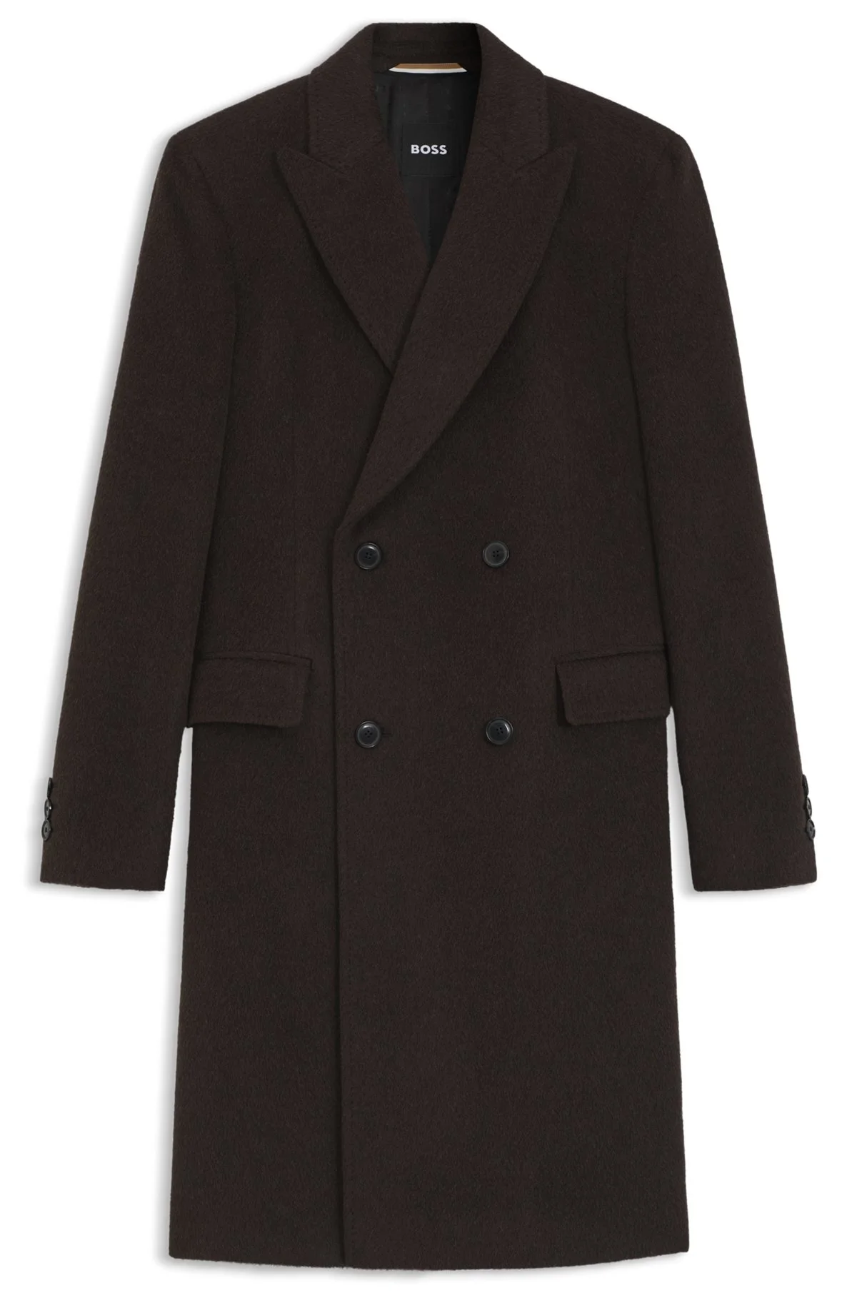 SIZE AND FIT The model wears a size 38R and is 6'1" tall with a, 37" chest, 29" waist and 35" hips. DETAILS With classic peak lapels and a double-breasted closure, this slim-cut BOSS Menswear coat is a formal essential. Alpaca-rich blend with virgin wool. Slim fit Peaked lapels Number of buttons: Double-breasted Pockets top: Flap pockets Button cuffs Back vent Fully lined H-Hyde-DB-Peak-254 - 50551135 QUALITY & CARE INSTRUCTIONS Do Not Tumble Dry Reduced Dry Clean Iron Low Heat Do Not Wash Material: 70% Alpaca, 17% Polyamid, 13% Virgin wool, Lining: 100% Viscose, Sleeve lining: 100% Viscose Do Not Bleach