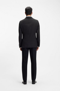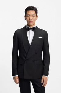 DETAILS Honor the dress code in BOSS Menswear style with this double-breasted tuxedo jacket. Crafted in soft silk with shawl lapels for evening-ready appeal. Shawl collar Number of buttons: 4 or more buttons Jetted chest pockets Pockets top: Flap pockets Fully lined L-Heston-Tux-DB-254 - 50549644 QUALITY & CARE INSTRUCTIONS Do Not Tumble Dry Reduced Dry Clean Do Not Wash Iron Medium Heat Material: 100% Silk, Lining: 100% Cupro Do Not Bleach