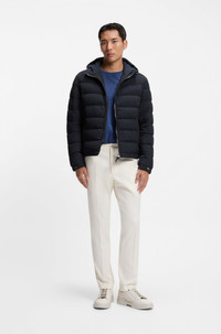 SIZE AND FIT The model wears a size 38R and is 6'1" tall with a, 36" chest, 29" waist and 36" hips. DETAILS Filled with certified duck down and feather, this water-repellent BOSS Menswear jacket is a trans-seasonal essential. Regular fit Partial cotton-flannel lining. Regular fit Hooded collar Fastening top: Zip closure Pockets top: Zip pockets Inside welt pockets Functional button Fully lined Standard length Fit back length: 65 cm (26 inches) L-Damoro - 50547203 QUALITY & CARE INSTRUCTIONS Do Not Bleach Do Not Dry Clean Material: 86% Polyamid, 14% Elastane, Lining: 86% Polyamid, 14% Elastane, Filling: 90% Duck down, 10% Duck Feather Tumble Dry Low Heat Machine Wash Cold Gentle very mild professional wet clean Iron Low Heat
