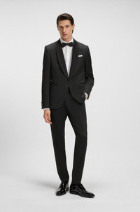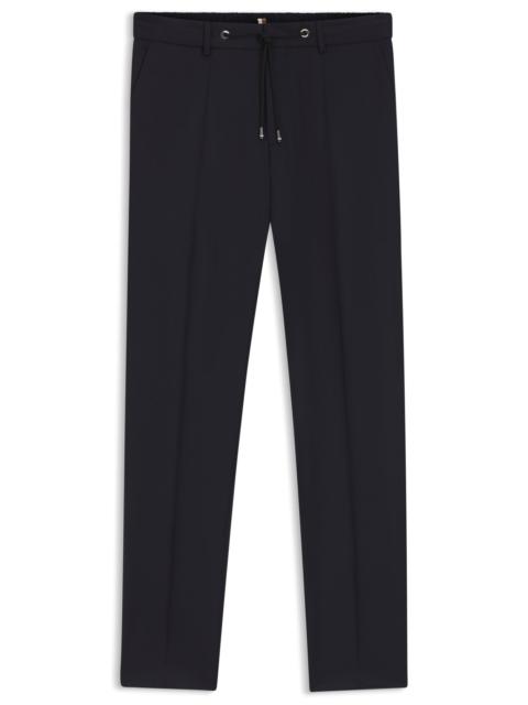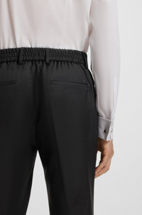 SIZE AND FIT The model wears a size 32R and is 6'1" tall with a, 33" chest, 26" waist and 33" hips. DETAILS H-Genius-DS-B1 - 50469169 Formal trousers by BOSS Menswear, designed for ultimate comfort. Topped with a drawcord featuring signature-stripe tips, these modern trousers are woven in virgin wool with a serge technique for refined style. For our RESPONSIBLE products, we always use at least 60% more sustainable raw materials. This garment is made from at least 60% responsible and certified wool. At HUGO BOSS, responsible wool means it meets the standards of the Five Freedoms of animal welfare. Slim fit Drawstring Crease Pockets bottom front: French pocket Pockets bottom back: Jetted pockets QUALITY & CARE INSTRUCTIONS Reduced Dry Clean Do Not Bleach Do Not Tumble Dry Iron Medium Heat Do Not Wash Quality: 100% Virgin wool, pocketing: 65% Polyester, 35% Cotton, knee lining: 100% Viscose