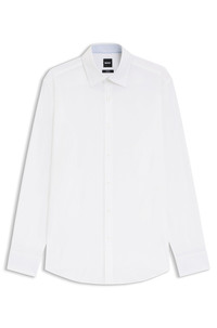 SIZE AND FIT The model wears a size EU:40 and is 6'2" tall with a, 37" chest, 29" waist and 37" hips. DETAILS Cut to a defined fit in easy-iron poplin, this BOSS Menswear shirt combines style and practicality. Soft stretch cotton. Slim fit Kentkragen Round cuffs H-HANK-K-C3-261 - 50555668 QUALITY & CARE INSTRUCTIONS Dry Clean Only Material: 96% Cotton, 4% Elastane Do Not Tumble Dry Iron Medium Heat Machine Wash Warm Do Not Bleach