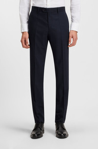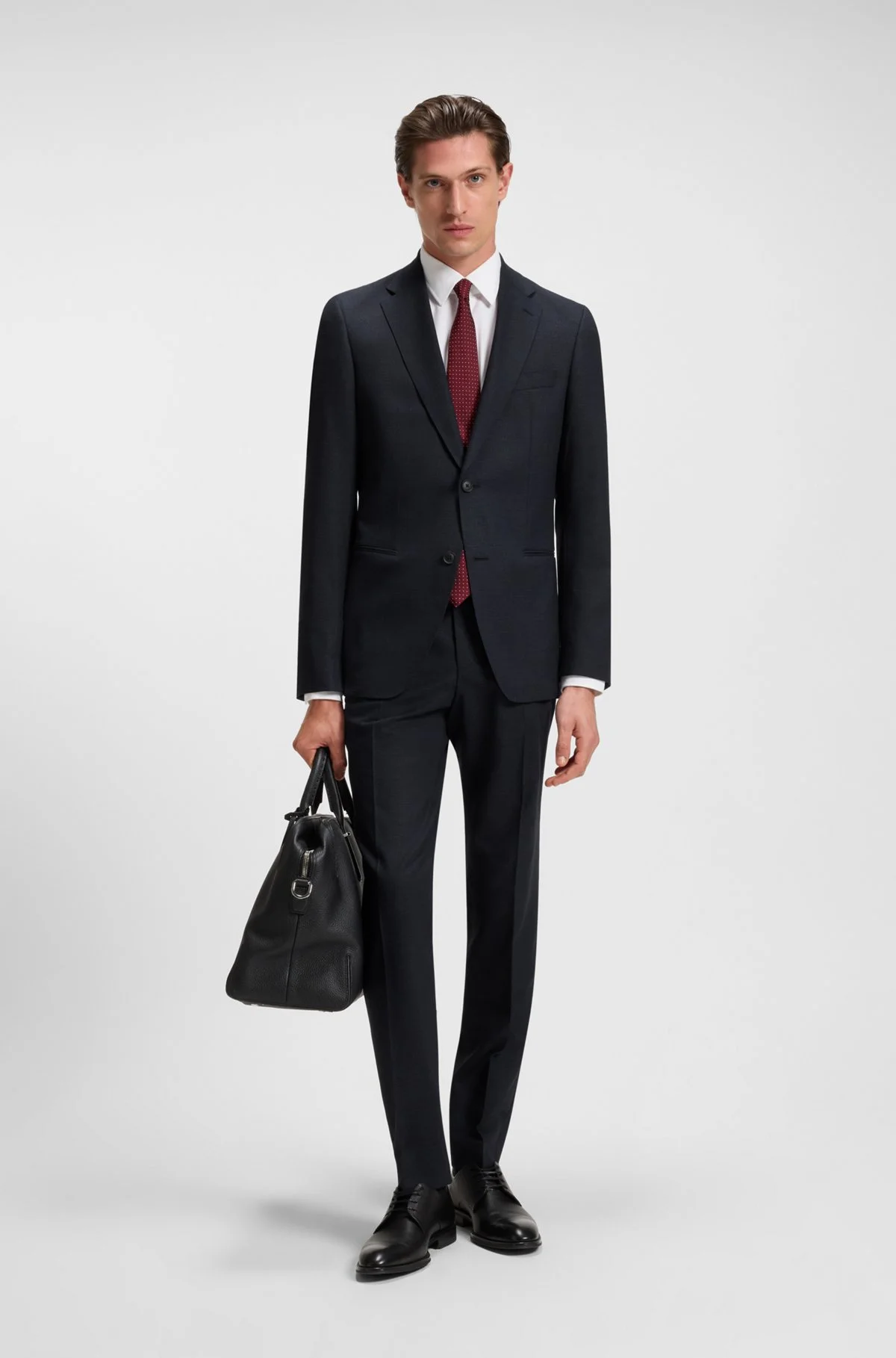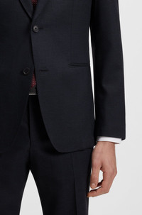 DETAILS C-Huge-2Pcs-252 - 50551777 With a light pattern, this BOSS Menswear suit presents a host of styling options. This two-piece suit is cut to a defined fit in a wool blend that contains added stretch for total freedom of movement. Create a range of looks with BOSS shirts or knitwear. Slim fit Notched lapels Number of buttons: 2 Jetted chest pockets Pockets top: Welt pockets Kissing buttons on the cuff Partially lined Packaging: Dust bag QUALITY & CARE INSTRUCTIONS Do Not Tumble Dry Reduced Dry Clean Iron Low Heat Do Not Wash Quality: 60% Virgin wool, 23% Viscose, 15% Polyester, 2% Elastane, Lining: 95% Polyester, 5% Elastane, Sleeve lining: 100% Viscose, knee lining: 100% Viscose Do Not Bleach