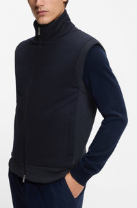 DETAILS In brushed flannel blended with wool, this BOSS Menswear gilet makes a refined layer. Ribbed trims and double-ended front zip. Regular fit Pockets top: Welt pockets Standard length P-Heflono - 50550007 QUALITY & CARE INSTRUCTIONS Reduced Dry Clean Material: 55% Polyester, 45% Virgin wool, Lining: 100% Polyamid, Front panel: 62% Polyester, 24% Viscose, 12% Wool, 2% Elastane, Wadding: 100% Polyester (80% recycled) Do Not Tumble Dry Do Not Bleach Iron Low Heat Cold, gentle machine wash; reduced spin speed.