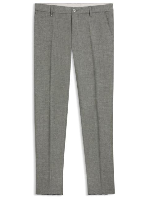 SIZE AND FIT The model wears a size 32R and is 6'2" tall with a, 37" chest, 30" waist and 37" hips. DETAILS C-Genius-252 - 50540717 With a subtle pattern that's easy to style, these BOSS Menswear trousers are ideal for wedding season. Blended with stretch and linen. Slim fit Button closure Pockets bottom front: Side slash pockets Pockets bottom back: Welt pocket Partially lined QUALITY & CARE INSTRUCTIONS Do Not Wash Do Not Tumble Dry Do Not Bleach Iron Low Heat Reduced Dry Clean Quality: 57% Viscose, 39% Linen, 2% Polyamid, 2% Elastane, pocketing: 65% Polyester, 35% Cotton
