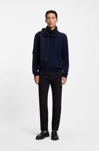 SIZE AND FIT The model wears a size pce. and is 6'1" tall with a, 33" chest, 24" waist and 36" hips. DETAILS Naster_35*180 - 50517218 A signature scarf with a logo label in synthetic coated fabric by BOSS. This accessory features twisted fringes. Synthetic coated fabric, sometimes referred to as faux leather, is a fabric designed to resemble real leather, and/or display a matte, glossy, smooth, or textured, coated appearance. QUALITY & CARE INSTRUCTIONS Do Not Tumble Dry Quality: 100% Wool Hand Wash Only Iron Low Heat Do Not Bleach Dry Clean Only