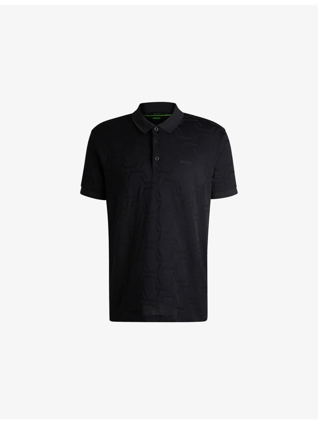 PRODUCT DETAILS - BOSS cotton polo shirt - 100% cotton - Exposed button fastening at front - Relaxed fit, collar, short sleeves, all-over geometric-inspired jacquard pattern, rubberised branding at chest, flat-knit trims to collar and cuffs - Machine wash cold - Lightweight, non-stretch Ref: R04329822