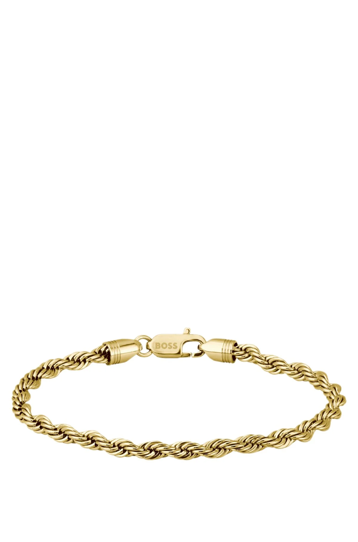 DETAILS Crafted in gold-tone steel, this BOSS Jewelry cuff has a rope-style chain to elevate the everyday. Lobster closure with stripe detailing and logo. Wrist circumference: 19 cm – 7.48 inches; width: 0.5 cm – 0.20 inches MYLES - HB1580810 QUALITY & CARE INSTRUCTIONS Material: 100% Stainless steel